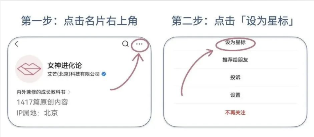 特简单,点击「女神进化论」公众号头像→点击右上角…→选择第一个「设为星标」