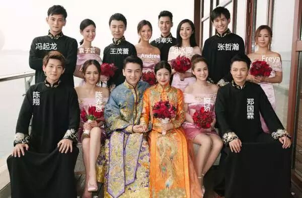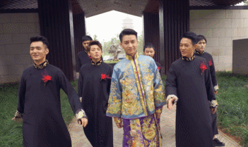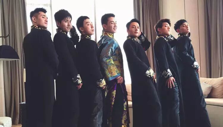 而另一边,身穿绣金龙纹图案蓝色中式礼服的陈晓则带着身穿黑色长衫的陈翔、郑国霖、王茂蕾、张哲瀚、冯起龙、何奉天等好兄弟,手持红色捧花,气势满满地预备“抢亲”