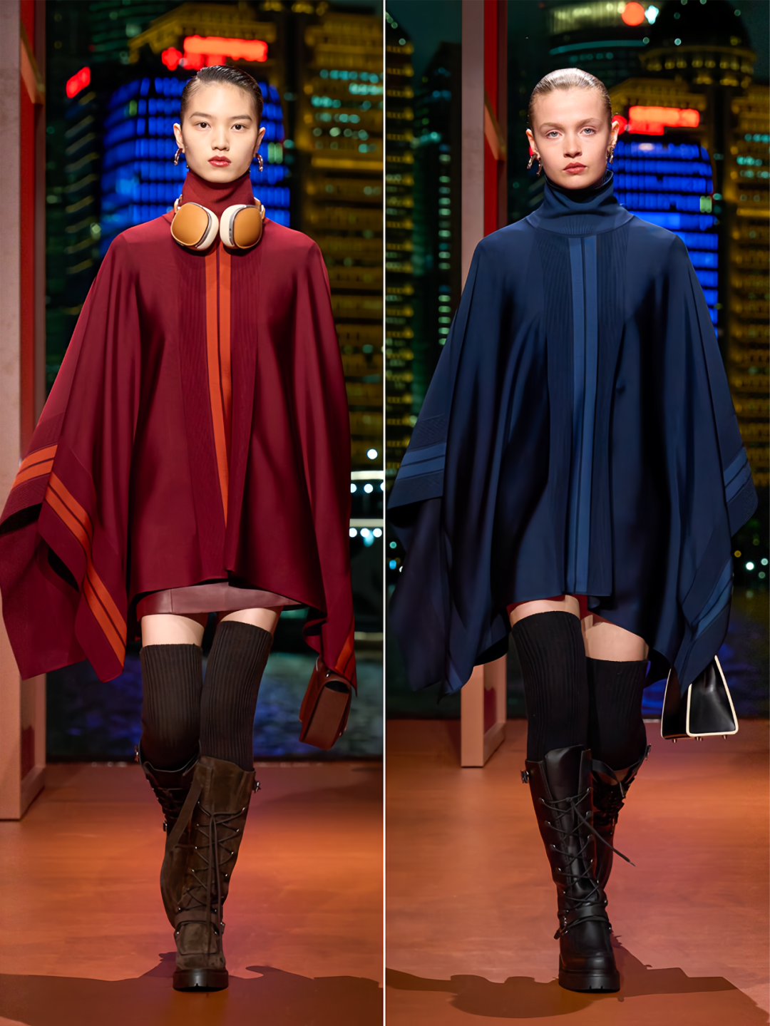 爱马仕标志性马毯延展为华美披风式毛衣与流动感裹身大衣,以双面羊绒新释。▼