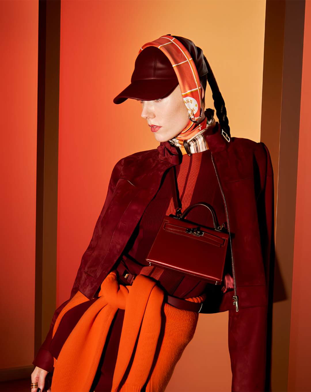 手袋部分 Kelly 手袋成为主角,不同材质的迷你款 Kelly 手袋被挎在胸前,或系在腰间,以类似配饰的形式融入穿搭,轻松解放双手。▼