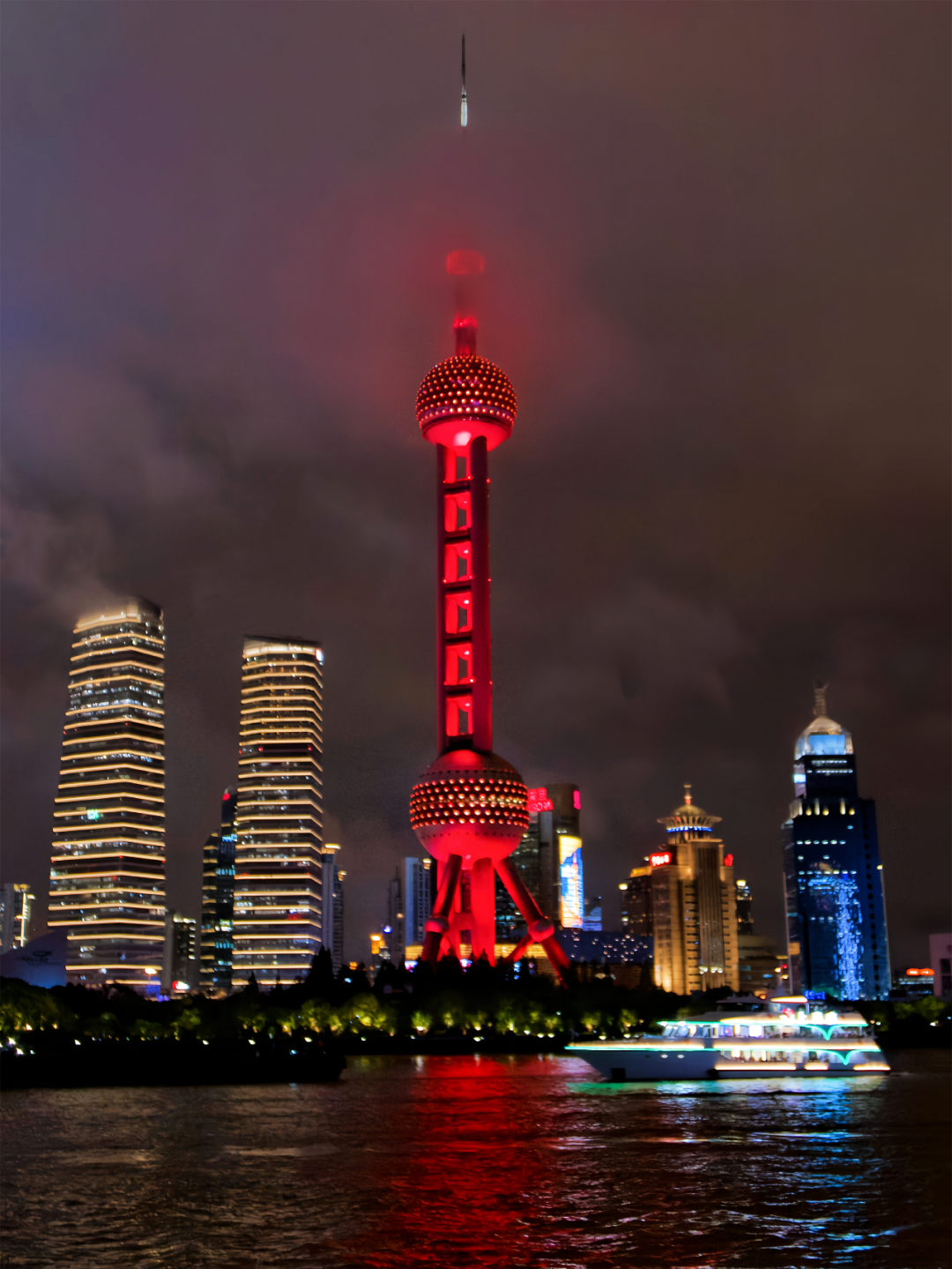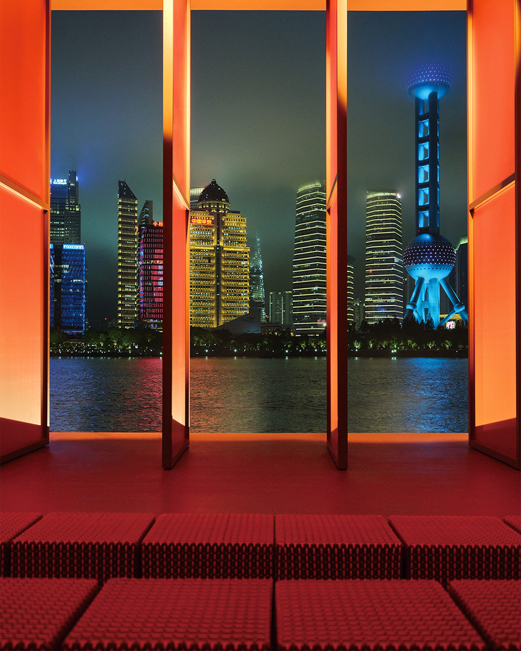 屏风旋转,夜幕下的东方明珠和摩天大楼霓虹交错,璀璨映耀,承载着城市印记的黄浦江,映射出这座活力都市的澎湃能量,现场的视觉效果超级震撼。