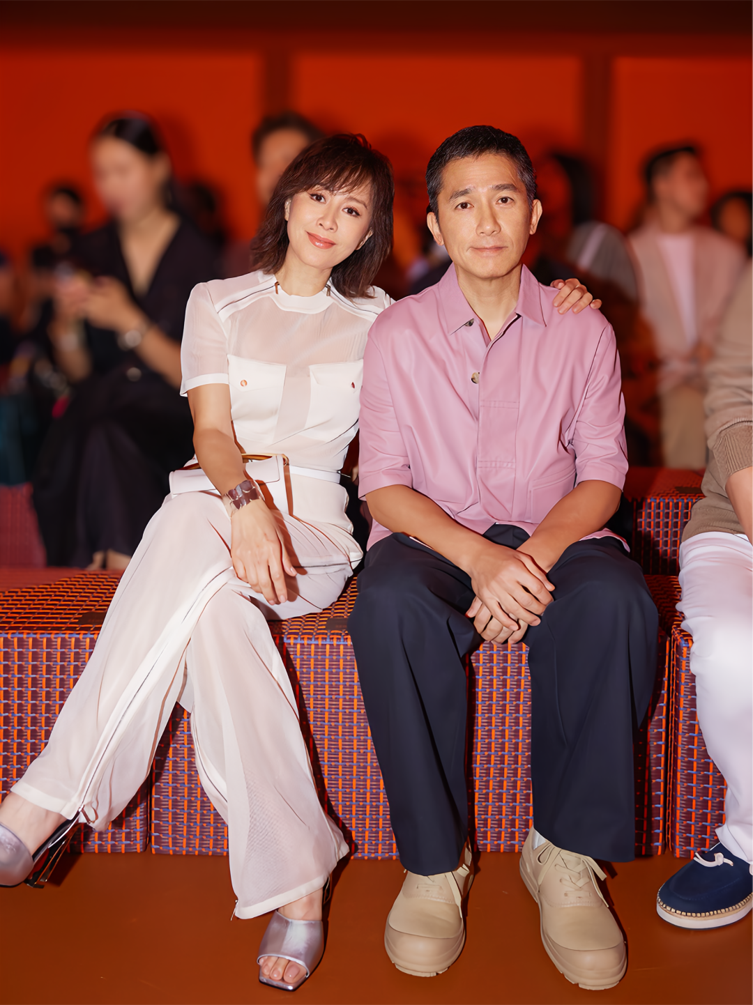 刘嘉玲梁朝伟夫妇就来看秀了,刘嘉玲身穿 2025 春夏女装系列的白色透视套装,很有气场,梁朝伟穿 2025 春夏男装系列的粉色衬衫配长裤,造型慵懒松弛。(全程拍摄梁影帝都露出一种“拍完了吗咱们快走吧”的神情,乖巧无比,哈哈哈哈哈)▼