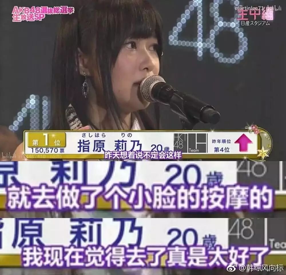 这次意外的夺冠成了指原人气一飞冲天的起点。紧接着的15、16、17年,指原三年登顶一位,达到了前无古人的成就——48系总选举三连冠。