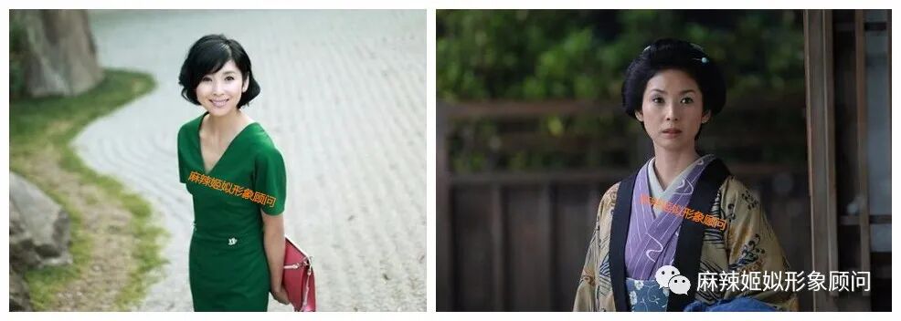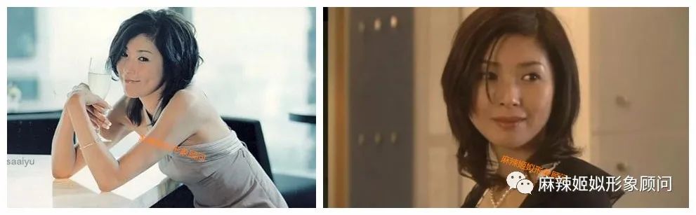 我们身上的柔美感,可以来自穿衣风格,也可以来自色彩特征,黑木瞳的柔美感,跟穿衣风格没有一点关系,她的这份柔美只是她的色彩特征在影响着,所以发型与服饰上,挺柔美的元素,放到她身上反而不太好看,而直线感很明显的右图发型,放在黑木瞳的身上是不是显得她气质很好?