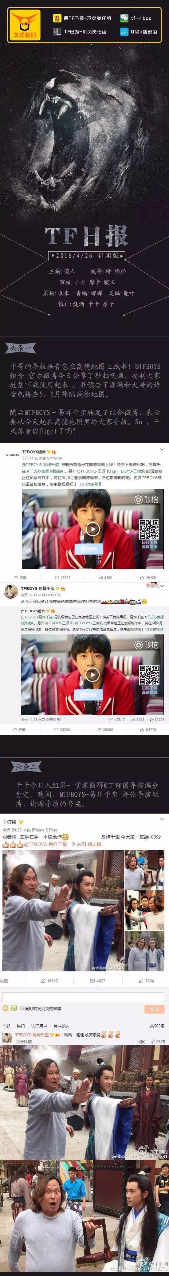 『TFBOYS』TF日报 -不负责任组>>2016<<0426期 内地男星 2016-04-28 18:45:43 171 创作不易,用心坚持,欢迎请BaGua喝几杯爱心咖啡!打赏并支持本文 打赏并删除本文 #TFBOYS# #TF日报(不负责任组)# 【20160426】@TFBOYS组合 千玺的导航语音包在高德地图上线啦!小凯源源的语音包随后就到。【友情提醒:千万不要开车的时候被导航里的千式苏音迷得忘记自己在干嘛啊喂!千千今天终于进组《思美人》!导演@丁仰國 对千千满分肯定!【谢谢导演夸奖!】蒙牛酸酸乳“TFBOYS守护星系”计划完满落幕 ,星星都有主叻! 创作不易,用心坚持,欢迎请BaGua喝几杯爱心咖啡!打赏并支持本文 打赏并删除本文 感谢您的支持鼓励,我会继续努力的!文章地址:用户邮箱:打赏金额:USDT 请输入数字点击”去打赏“,即可进行打赏支持本文章哦 tfboys 发表评论