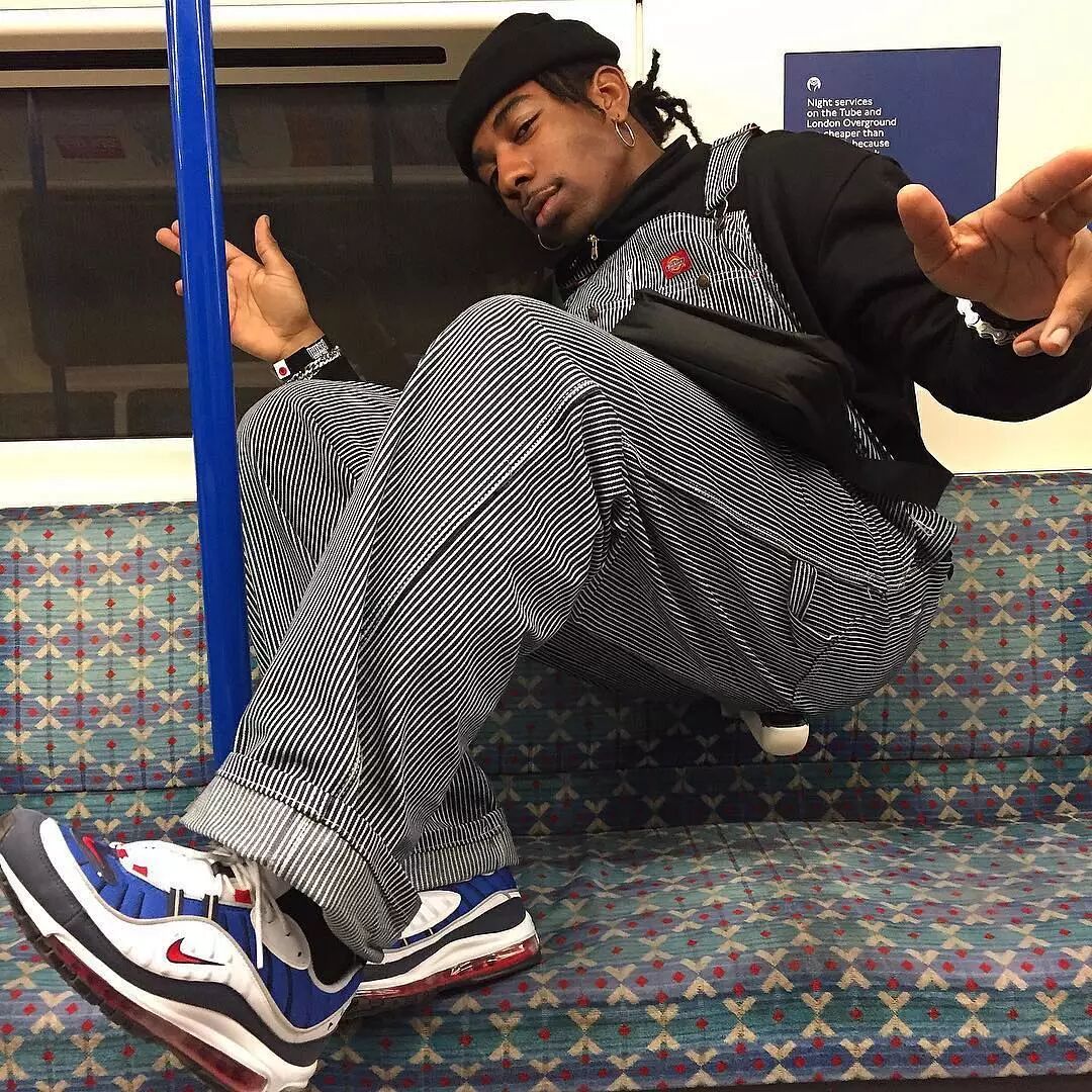 复古蓝白高达配色的Nike Air Max 98 OG Gundam搭上竖条纹背带裤,潮味十足。