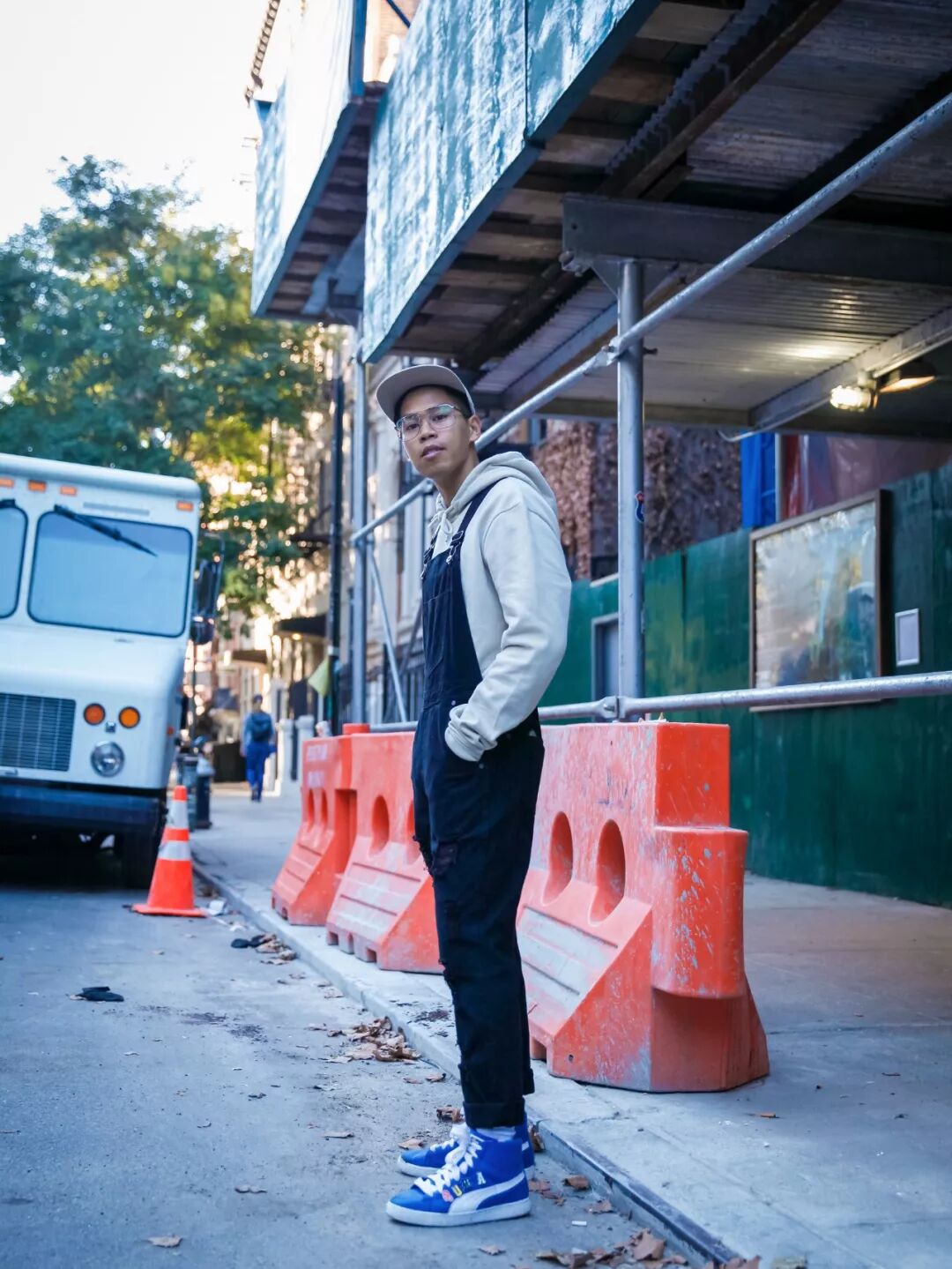 抢眼的蓝色高帮PUMA,刚好中和了上身较低调的土色卫衣内搭,让整个LOOK有个亮点。