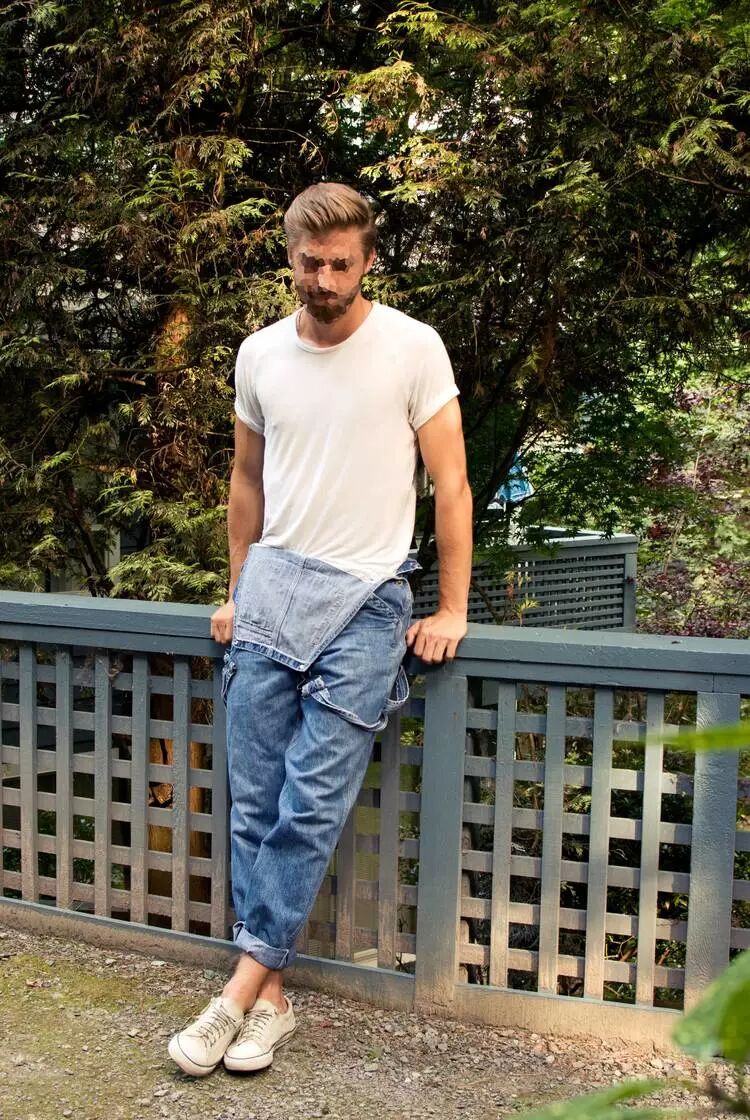 常见的背带裤穿搭:basic tee x 背带裤,来自你的男孩TT。