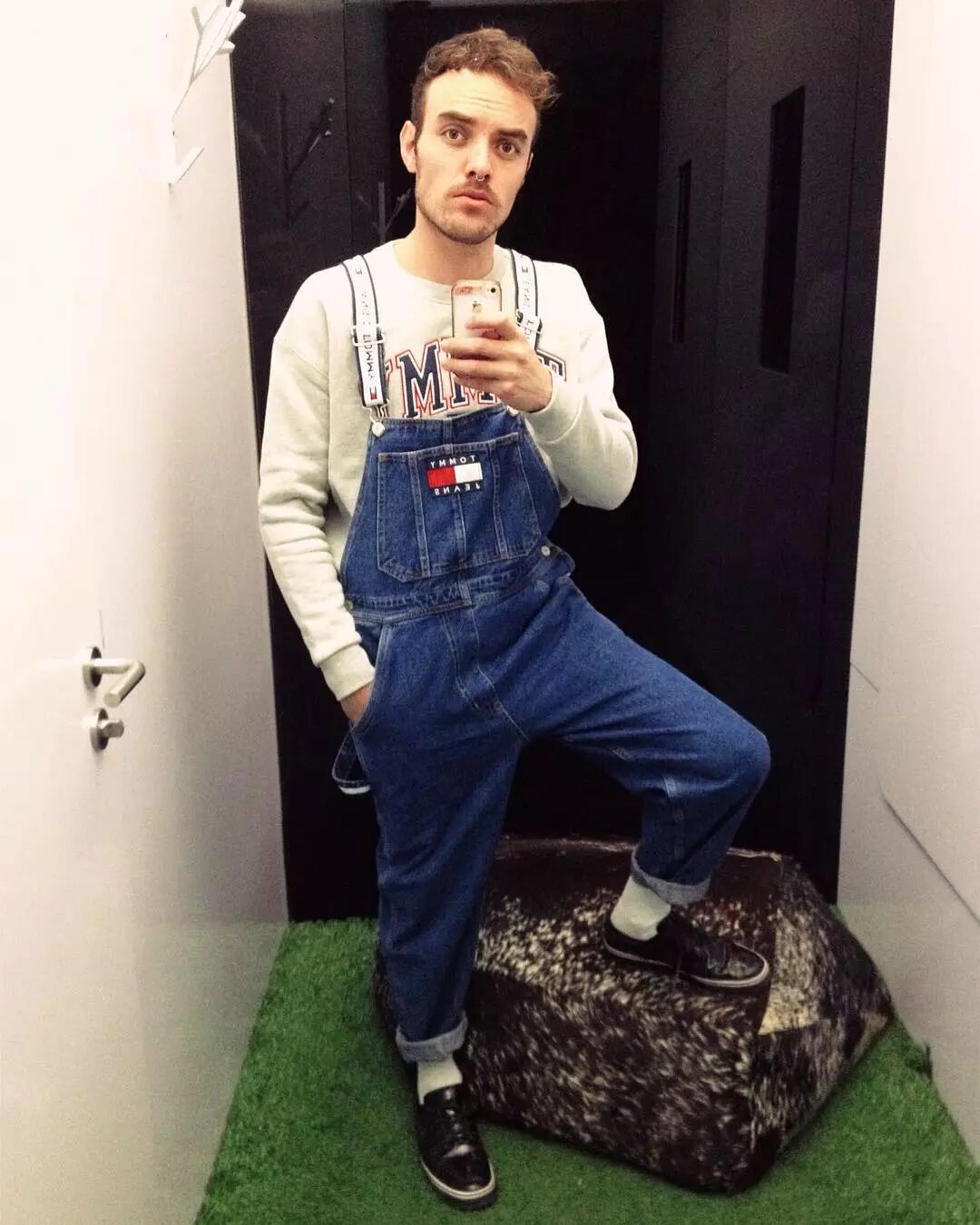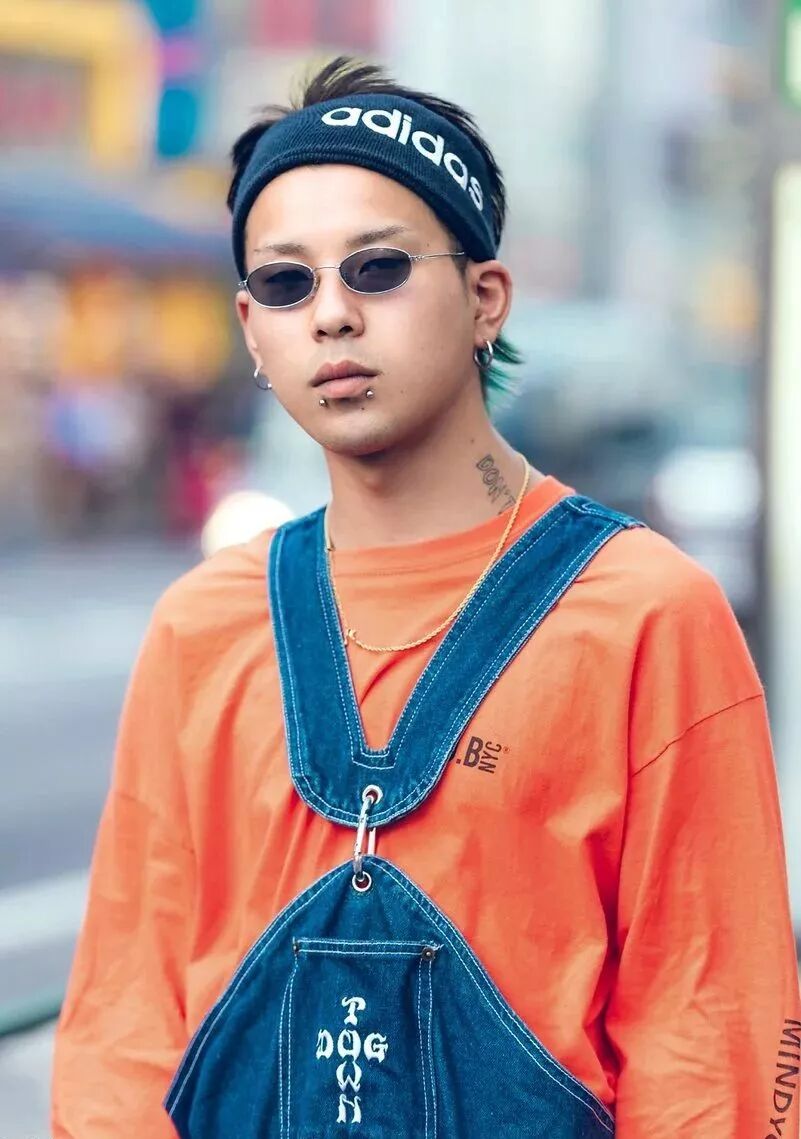 耳环、唇钉、金链等 thug life 金属元素,都是让你变得更MAN的单品,再加上运动发带、王家卫同款墨镜,这个反穿背带裤的男孩必须列入背带裤穿搭范本了。