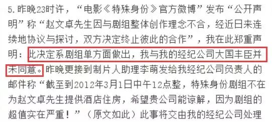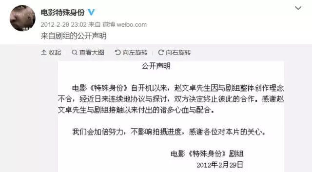 谁知道发布会刚过去一个多月,片方就在官方微博上发表声明,称与赵文卓理念不合,结束双方合作关系。