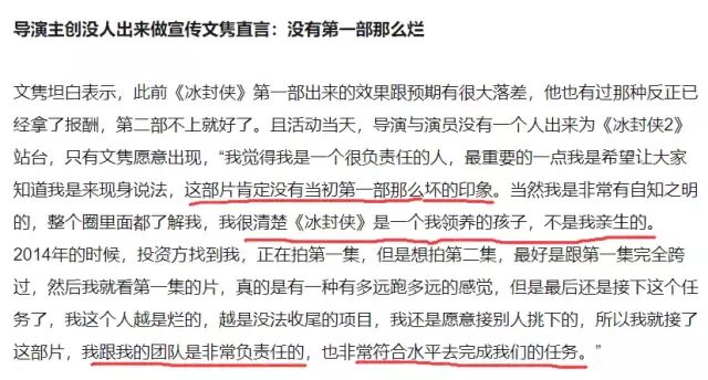 当时文隽在接受采访时还说《冰封侠2》没有第一部烂,虽然是自己“领养的孩子“,但也尽心尽力地完成了任务。并表示对电影“有信心“,会给观众带来”耳目一新“的感觉。