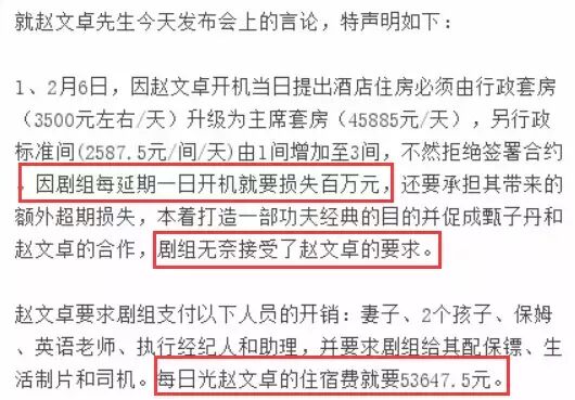 针对赵文卓的声明,剧组直接爆料称赵文卓拍摄期间耍大牌,提出住宿等要求不合理。言论一出,吃瓜群众就不淡定了,毕竟明星耍大牌这种事平日里在新闻里都是捕风捉影的多,真正正面开撕的却没几个~