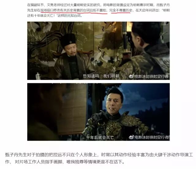 1、没常识还爱装逼,乱改台词,不尊重历史,在天启年间说出“明朝还有十年就灭亡”的无知台词,而且拒不重拍,在片场自持动作经验丰富大肆干涉动作导演工作,对工作人员指手画脚: