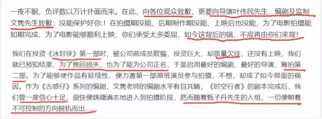 出品方开篇就给电影导演、编剧道歉,表示“数以万计的负评数”的锅不应该由他们来背。第二部剧本完成后,出品方等曾一度“信心十足”,但甄子丹入组后,”一切就脱轨了。”