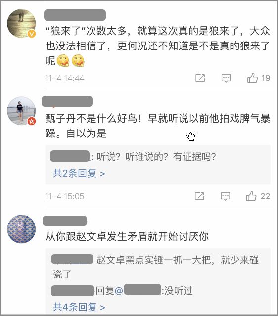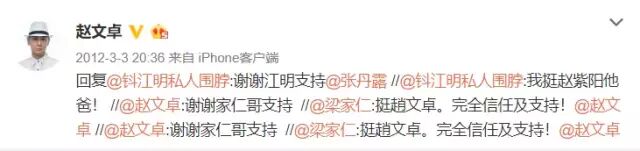这场骂战在微博上越演越烈,不少明星都掺和其中,力挺各自的好友,赵文卓和甄子丹二人在微博里不断转发支持自己的言论。现在回看有点幼稚啊,有事就说事,搞这些干什么~