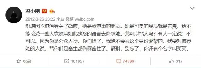 后来冯小刚也加入了战场,出面力挺舒淇,有些网友戏称他是“护舒宝”,冯小刚气不过连发微博和网友互怼。
