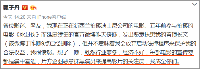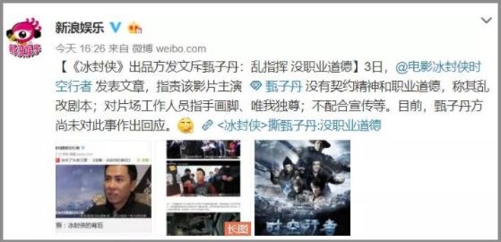 出品方在电影官方微博里发表的diss长文,直接点名甄子丹,斥他没职业道德和契约精神,并仿效赵丽颖的“官宣”,把文章简命名为:官撕。