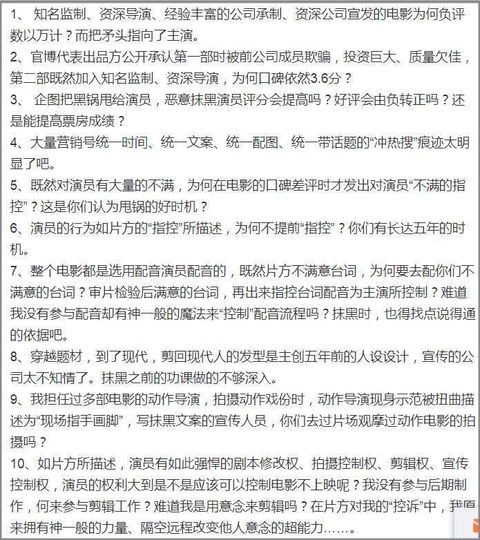 甄子丹列出了20条理由,反驳还是很有力的。那么多人参与的一部电影,把责任全盘甩给一个演员,是有点扯了。