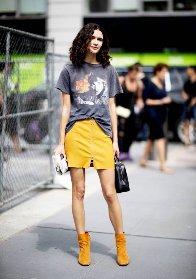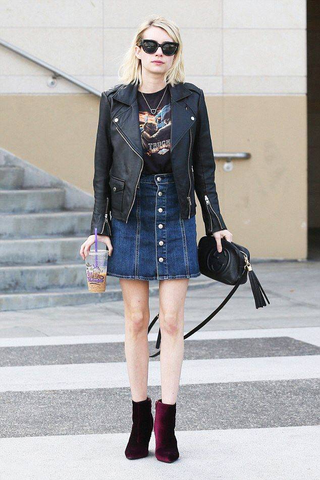 对于身高不占优势的姑娘来说,及踝靴或者高过脚踝5cm以内的短靴最保险,比如Emma Roberts脚上这双天鹅绒短靴高度就比较合适,再加上高腰短裙的“助攻”,身高157cm的她看起来腿也很长。