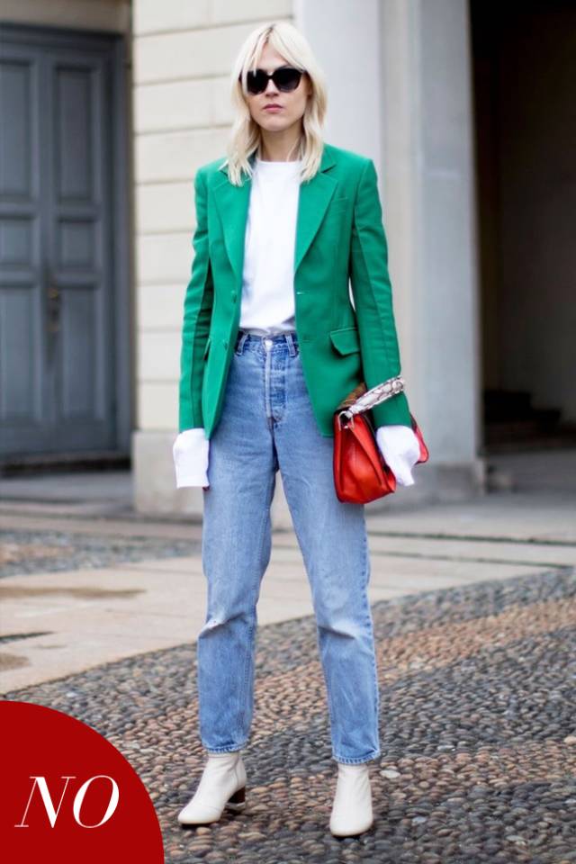 但也要“适可而止”,稍稍盖过一点没问题,像这种裤腿快碰到脚面的穿法会让下半身看起来特别笨重。