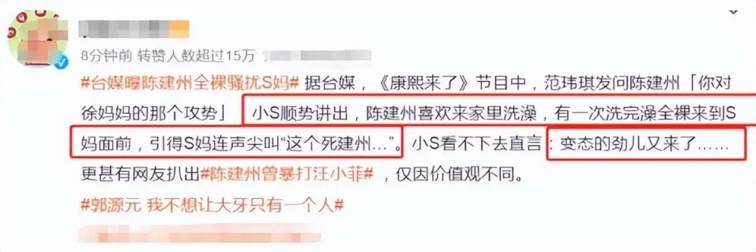 陈建州除了爆出了这些丑闻以外,之前小s在节目中也曾控诉过陈建州的所作所为,是因为当时他竟然骚扰自己的妈妈。