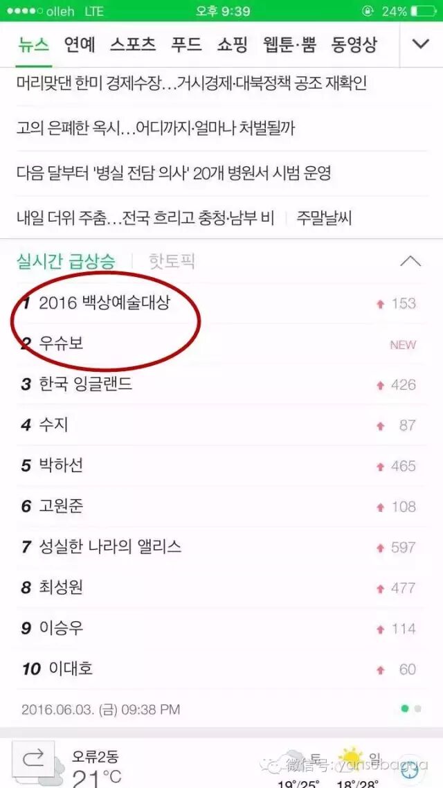 总之这么一折腾吴秀波就上了韩国实时热搜……红圈里第一个词条是2016百想艺术大赏,第二名是吴秀波