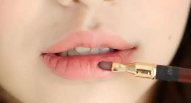 用粉底遮盖唇色后,使用玫色描画咬唇妆感。