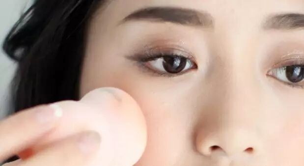 使用液态的珠光腮红斜向点涂在面颊,再用海绵拍打过渡。