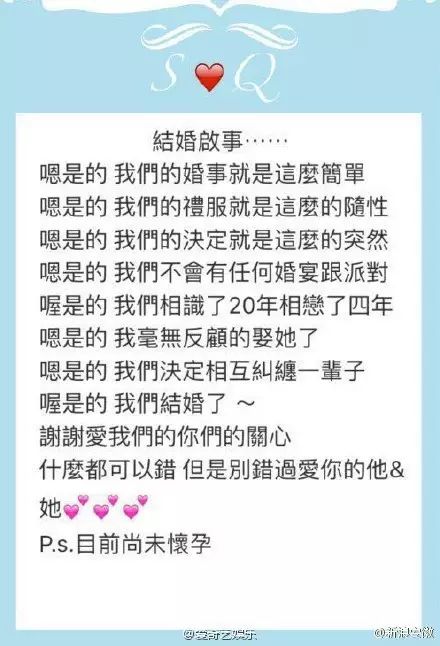 冯德伦宣布已经和舒淇结婚,冯德伦表示:“恩是的,我们的婚事就是这么简单;恩是的,我们的礼服就是这么随性;恩是的,我们的决定就是这么突然;嗯是的,我们不会有任何婚宴跟派对;嗯是的,我们相识了20年相恋了四年;嗯是的,我义无反顾地娶了她;嗯是的,我们决定相互纠缠一辈子;喔是的,我们结婚了:谢谢爱我们的你们的关心,什么都可以错,但是别错过爱你们的他(她)。PS,目前尚未怀孕。”