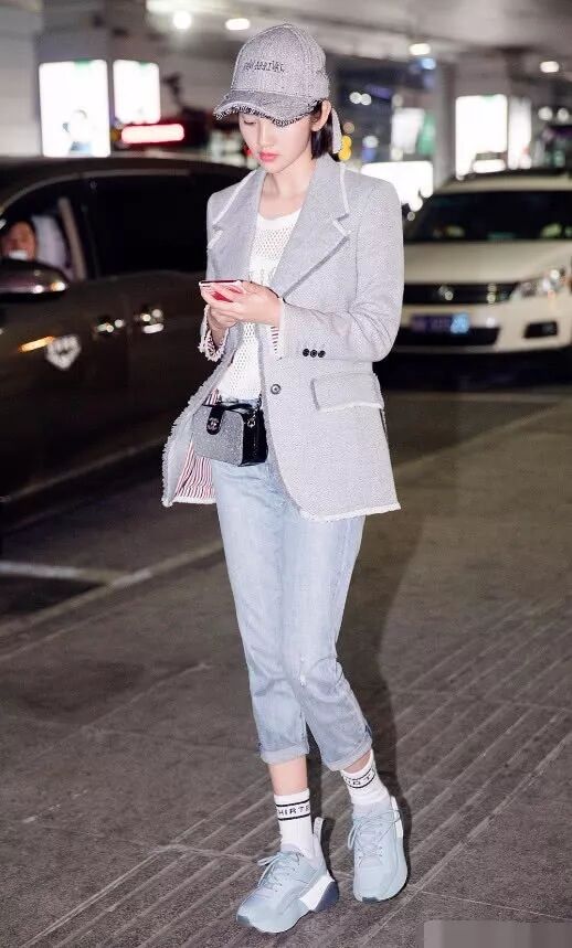 不久之前,唐艺昕现身某机场时,身穿一件浅灰色西服外套,搭配白色网格上衣和牛仔裤,整体造型看起来十分简约,却无时无刻不透露出一股时尚、休闲的气息。白色上衣采用了圆领的设计,巧妙地展示出了唐艺昕迷人的锁骨,显得她又瘦又美。