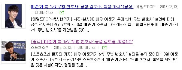 tvN 드라마국 한 관계자는 13일 스포츠한국에 "이준기는 '무법변호사' 관련 긍정적으로 검토 중이나 확정은 아니다"고 밝혔다. '무법변호사'가 내달 10일부터 주말 오후 9시 30분에 방영되는 tvN '라이브' 후속작으로 오는 5월 전파를 탈 가능성에 대해선 "편성을 협의 중이다"고 설명했다.