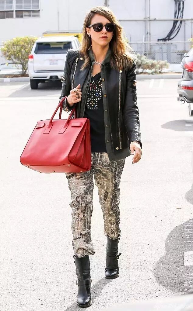 美国演员Jessica Alba一身帅气皮夹克出行,手拿大红色包包非常抢镜,十足辣妈范儿。