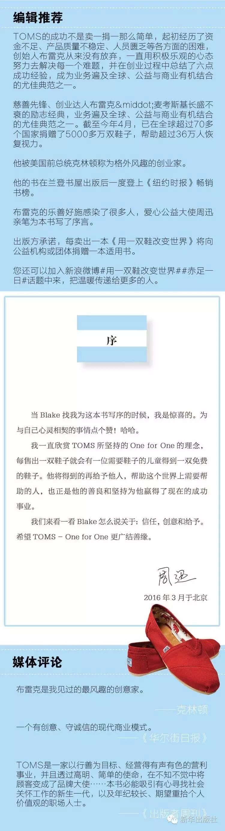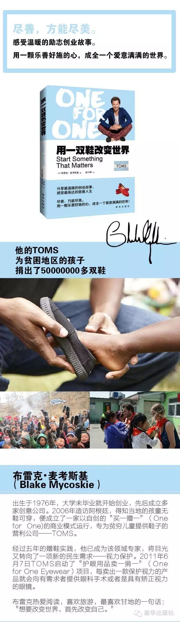 《用一双鞋改变世界》[美] 布雷克•麦考斯基 著赵习群 译字数:13万字定价:36.00元2016年5月出版 布雷克•麦考斯基(Blake Mycoskie),出生于1976年,大学未毕业就开始创业,先后成立多家创意公司。2006年造访阿根廷,得知当地的孩童无鞋可穿,便成立了一家以自创的“买一赠一”(One for One)的商业模式运行,专为贫穷儿童提供鞋子的盈利公司——TOMS。 经过五年的赠鞋实践,他已成为该领域专家,将目光又转向了一项新的民生需求——视力保护。2011年6月7日TOMS启动了“护眼用品卖一捐一”(One for One Eyewear)项目,每卖出一款保护视力的产品就会向有需求者提供眼科手术或者是具有矫正视力的眼镜。 布雷克热爱阅读,喜欢旅游,最喜欢甘地的一句话:“想要改变世界,首先改变自己。”