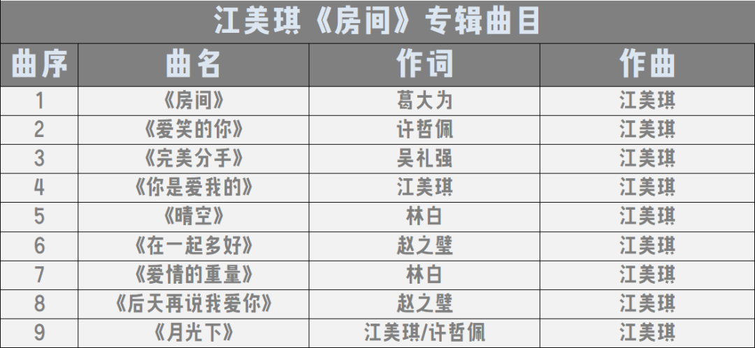 经过近两年的创作与筹备,《房间》专辑姗姗而来。专辑共收录九首作品,江美琪完成所有的作曲以及三首作品的填词,就歌手的首张创作专辑而言,江美琪算是厚积薄发。