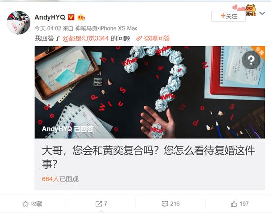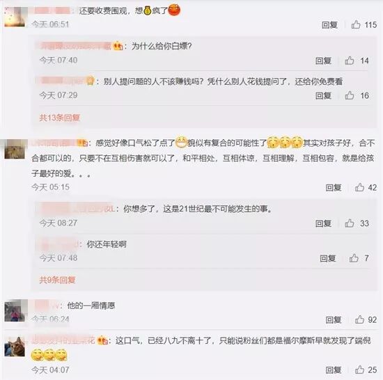网友也很好奇黄毅清会如何回答这个问题,但是黄毅清设置的却只能是付费围观,目前一块钱的价值,大约有600多人围观。网友看到黄毅清的这个态度也觉得他有点扭扭捏捏,或者是想钱想疯了!只是不知道是不是黄毅清也觉得无聊,最终这天微博刚刚已经不见了。毕竟他们有孩子,有人好像也理解他们的复合:感觉好像口气松了点了,貌似有复合的可能性了。其实对孩子好,合不合都可以的,只要不在互相伤害就可以了,和平相处,互相体谅,互相理解,互相包容,就是给孩子最好的爱。。。