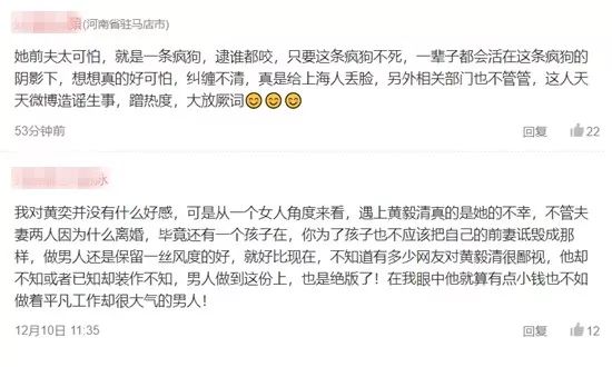 看着黄奕公开谈到离婚之后的感觉,不少网友也觉得同情:她前夫太可怕,就是一条疯狗,逮谁都咬,只要这条疯狗不死,一辈子都会活在这条疯狗的阴影下,想想真的好可怕,纠缠不清,真是给上海人丢脸,另外相关部门也不管管,这人天天微博造谣生事,蹭热度,大放厥词。有人还直言:我对黄奕并没有什么好感,可是从一个女人角度来看,遇上黄毅清真的是她的不幸,不管夫妻两人因为什么离婚,毕竟还有一个孩子在,你为了孩子也不应该把自己的前妻诋毁成那样,做男人还是保留一丝风度的好,就好比现在,不知道有多少网友对黄毅清很鄙视,他却不知或者已知却装作不知,男人做到这份上,也是绝版了!在我眼中他就算有点小钱也不如做着平凡工作却很大气的男人!