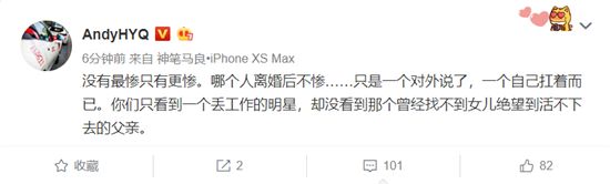只是有点奇怪的是,黄毅清在删了自己回答网友是否会和黄奕复合的问题之后,却再度发了一条微博:没有最惨只有更惨。哪个人离婚后不惨……只是一个对外说了,一个自己扛着而已。你们只看到一个丢工作的明星,却没看到那个曾经找不到女儿绝望到活不下去的父亲。 难不成他现在想开始卖惨?