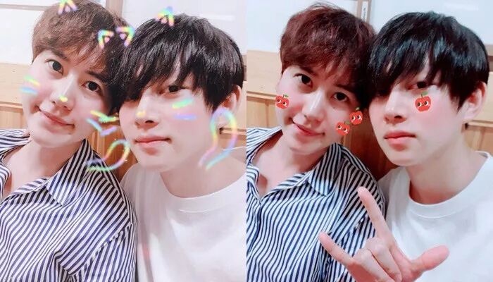 金希澈于22日在个人ins上传了一张与圭贤的合照,照片中两人多情地靠着脑袋正面看着镜头,帅气的面容让粉丝们心动不已。