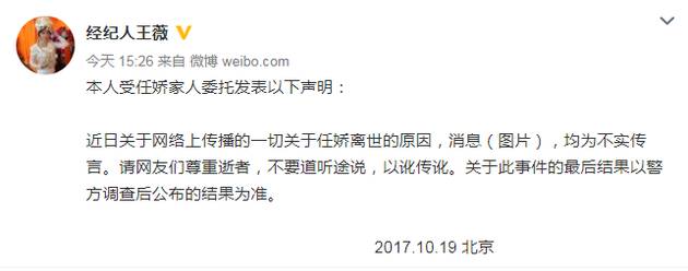 当时,任娇的经纪人王薇也曾在微博发表声明,称:“近日关于网络上传播的一切关于任娇离世的原因,消息,均为不实传言。请网友们尊重逝者,不要道听途说,以讹传讹。”