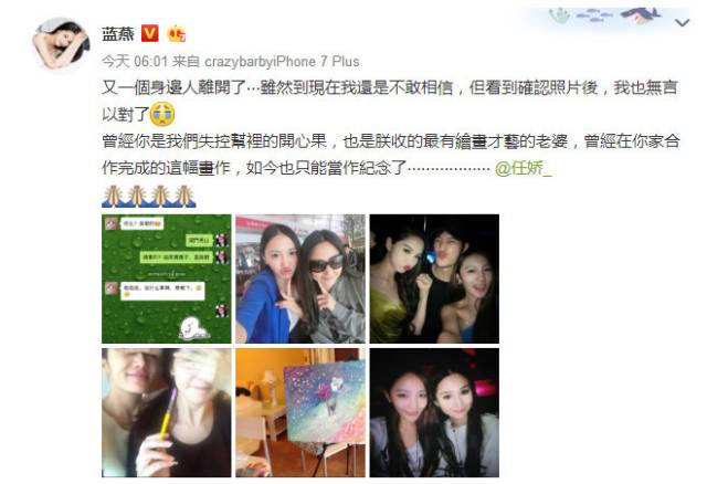 当天,演员蓝燕发微博感叹“又一个身边人离开了”,并配上多张与任娇的合影,疑似证实其死讯。