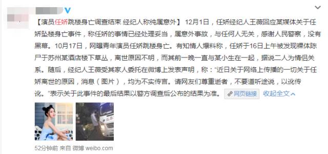 随后,腾讯娱乐从圈内某制片人口中得知,任娇死亡一事属实,但具体死因不明。