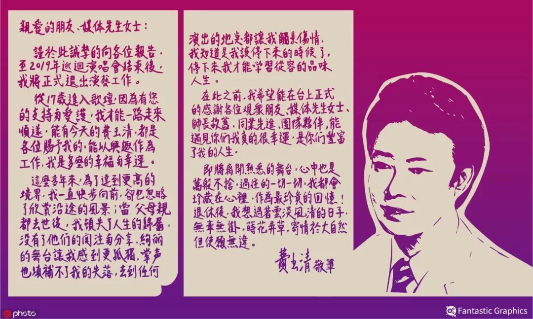 “从17岁进入歌坛,因为有您的支持与爱护,我才能一路走来顺遂,能有今天的费玉清,都是各位赐予我的,能以兴趣作为工作,我是多么幸福与幸运。