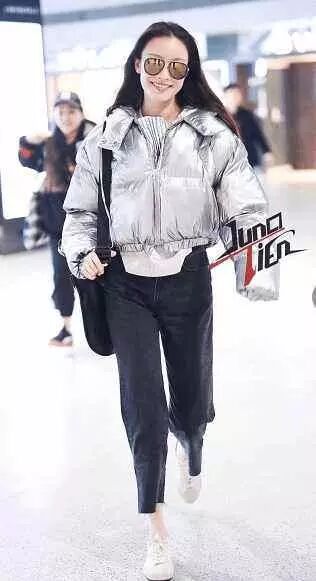 BlingBling的银色短棉衣,配上一条直筒灰色水洗阔腿裤,一双小白鞋,吸足了路人的眼球。
