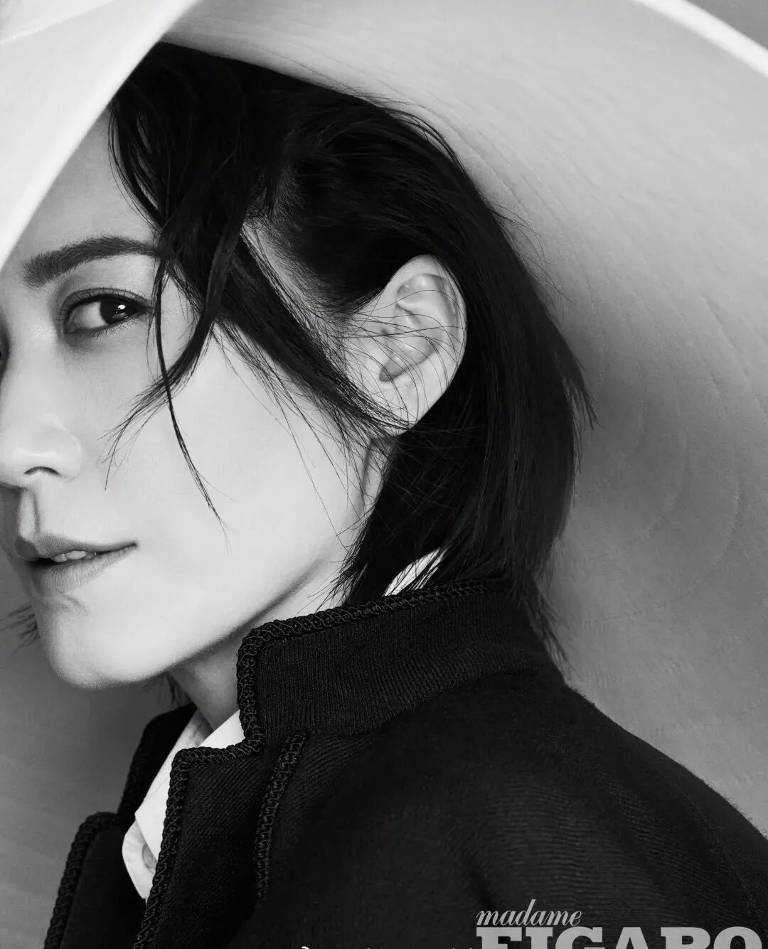 黑色短发,锐利的眼睛,男式方下巴,但锋利的M型嘴唇充满诱惑力,配上各式各样的黑色外套
