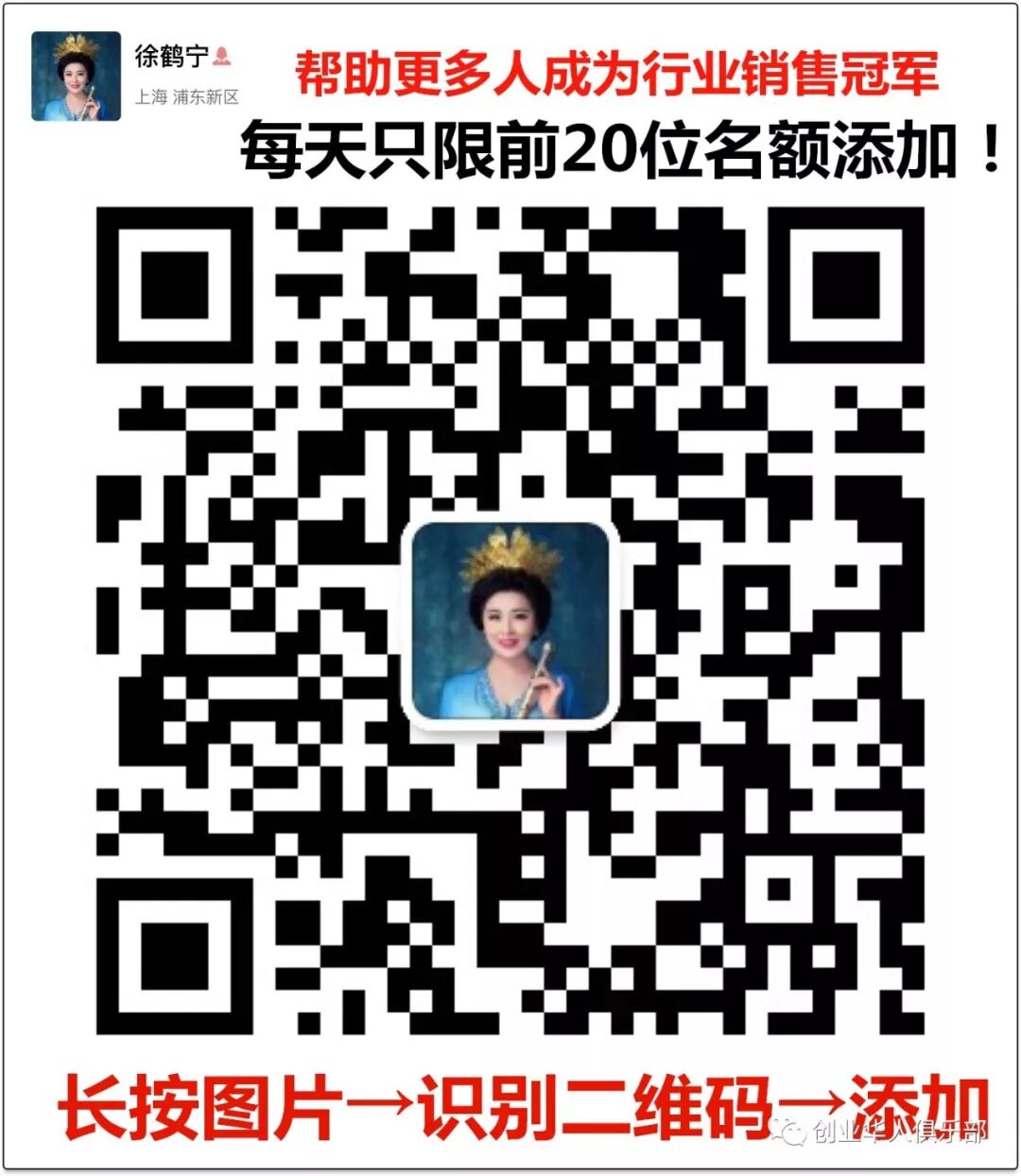 大家好!我是销售女神徐鹤宁老师,你有销售困惑吗?我来帮你解决,成功一定有方法,失败一定在原因,想要拥有更好、更快速的成功方法!原来的微信人数已满,请点击下面“关注”识别二维码添加我的新的个人微信进行互动,交流,学习。(业绩好的人都添加了)