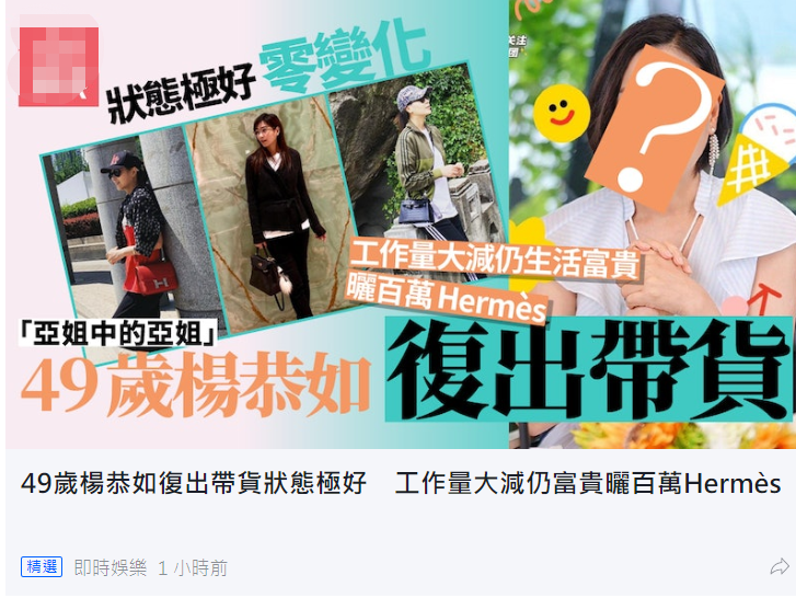 据港媒报道,有“最美亚姐”之称的杨恭如,在淡出娱乐圈多年后,最近在内地复出,并投身到直播带货的行列。