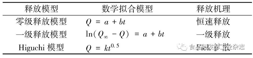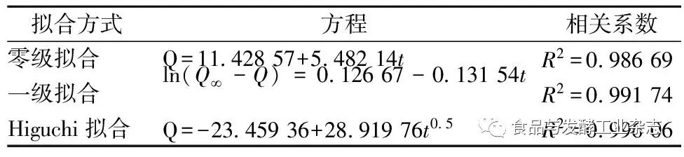 番茄红素微胶囊缓释动力学以常见表2中的动力学模型对番茄红素微胶囊14 h内释放性能进行模拟,探讨最佳的释放模型。