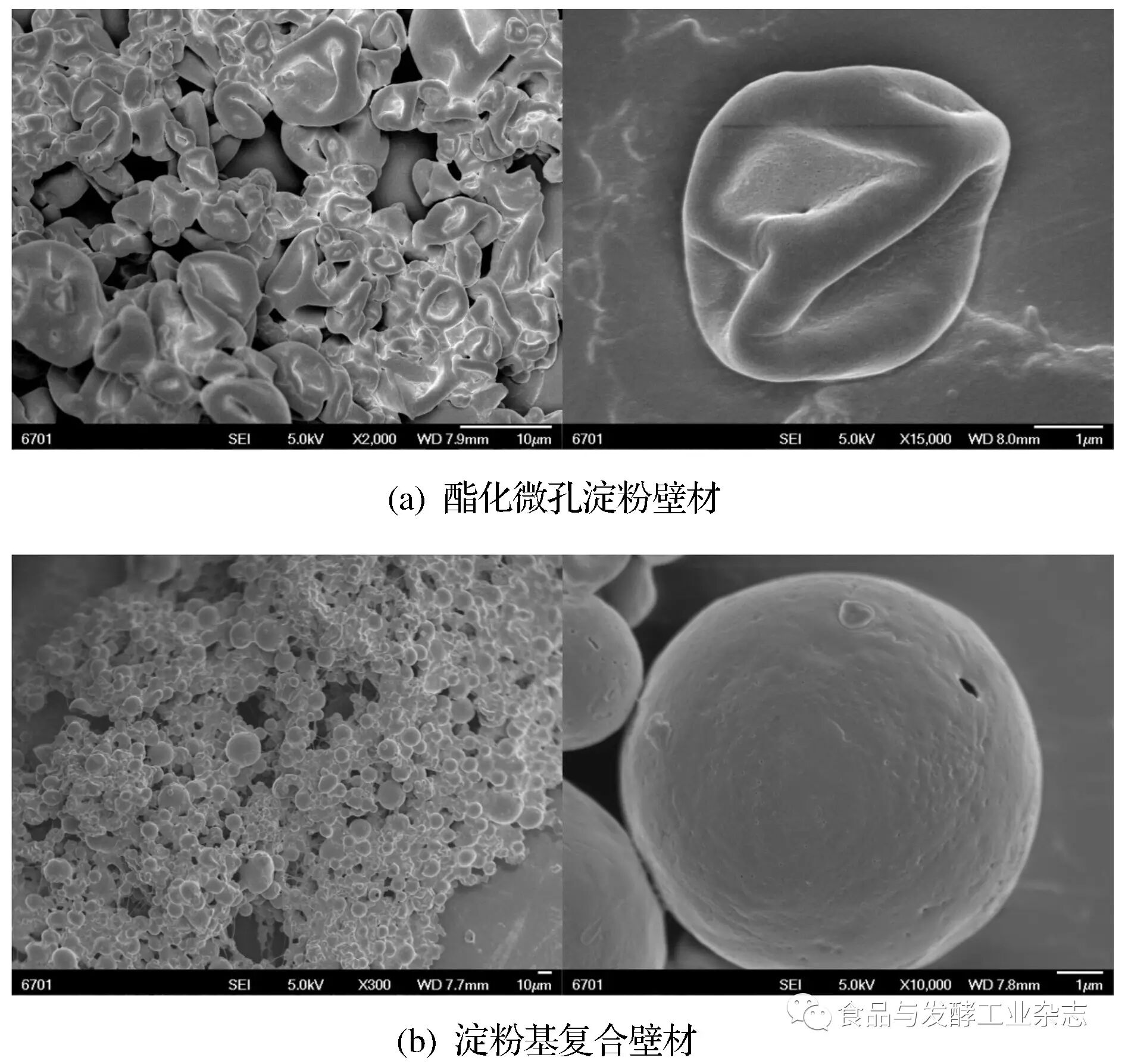 采用微孔酯化淀粉为壁材观察到较大的凹陷,分析其原因在于在冷冻干燥过程中酯化微孔淀粉的抗变形能力较复合壁材弱,且持水能力差,因此在冷冻干燥过程中,出现较大的收缩,导致表面凹陷。由于复合壁材中的蔗糖具有提高膜强度的能力,其加入明显能够改善微胶囊的形态,从图中可以看出复合基壁材的微胶囊呈圆球形,且表面较为光滑,微胶囊上面存在的细微孔洞是在冷冻干燥过程中细小的冰晶结构对其表面结构造成的破坏。微胶囊的缓释作用主要决定于囊壁的完整性、密封性, 因此推测所制备的微胶囊具有良好的缓释性能[19]。