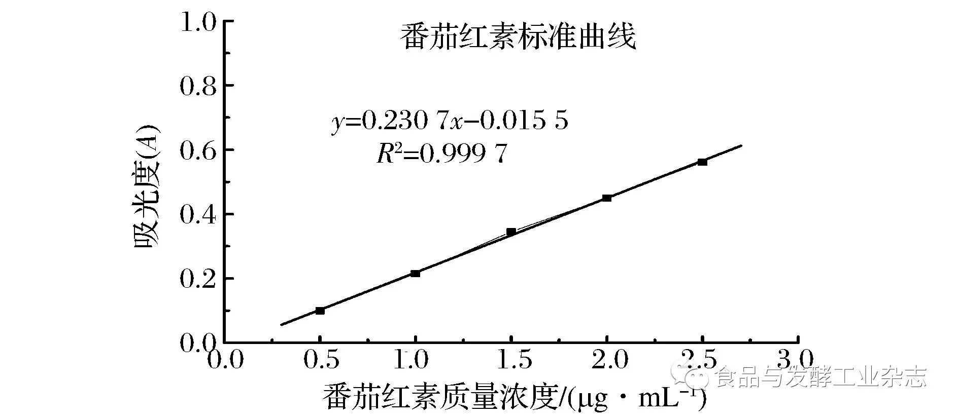 以番茄红素标准溶液质量浓度为横坐标,相应溶液的吸光度为纵坐标,绘制标准曲线(图1),线性拟合方程为y=0.230 7x-0.015 5,R2=0.999 7。表明番茄红素质量浓度与吸光度存在良好的线性关系,该曲线适合于测定番茄红素的含量,曲线适用的番茄红素溶液含量在0.5~2.5 μg/mL。