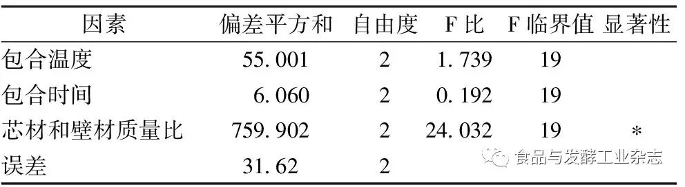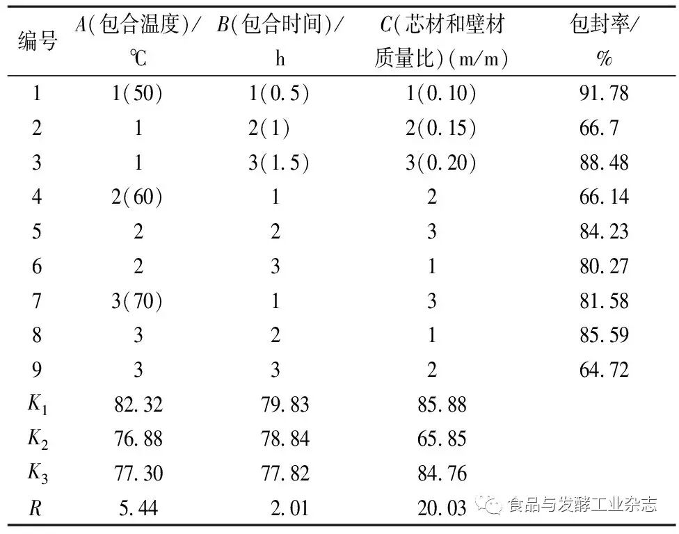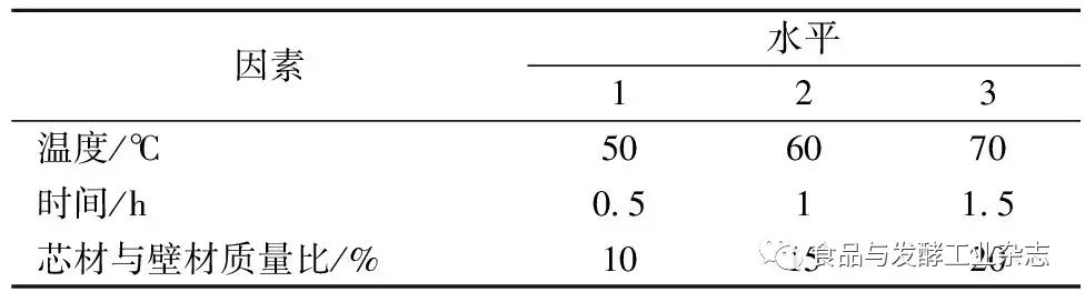 从壁材选择、芯材加入方式、包合时间、包合温度、芯材与壁材质量比、固形物含量等因素进行试验,在单因素的基础上,以包合时间、包合温度、芯材与壁材质量比为因素进行3因素3水平的正交优化实验,其因素水平表见表1。